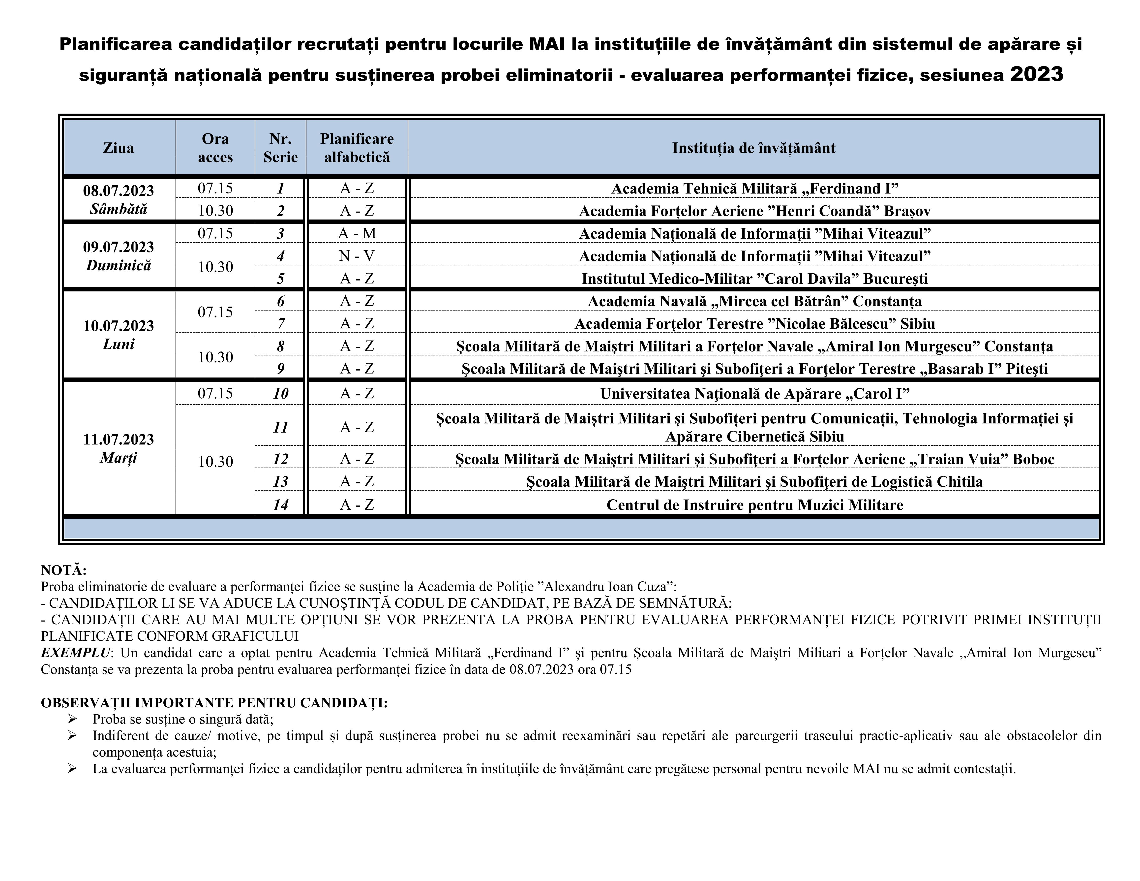 Planificarea candidaților recrutați pentru locurile MAI la instituțiile de învățământ din sistemul de apărare și siguranță națională pentru susținerea probei eliminatorii - evaluarea performanței fizice, sesiunea 2023