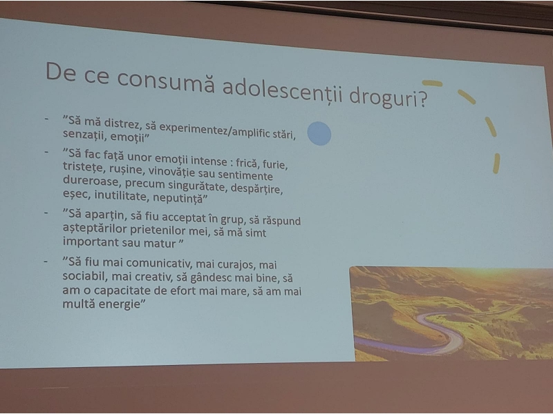 De asemenea, pe componenta de prevenire a traficului și consumului de droguri, au fost invitați ca speakeri parteneri din domeniu, respectiv reprezentanți ai Agenției Naționale Antidrog (d-na Alina NEAGOE, psiholog clinician și dl. Bogdan GHEORGHE, medic) și specialiști din cadrul Spitalului Județean Oradea – secția de psihiatrie (d-na Alina FORDON, medic).