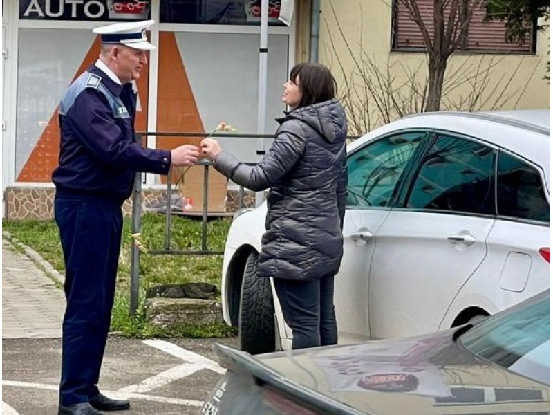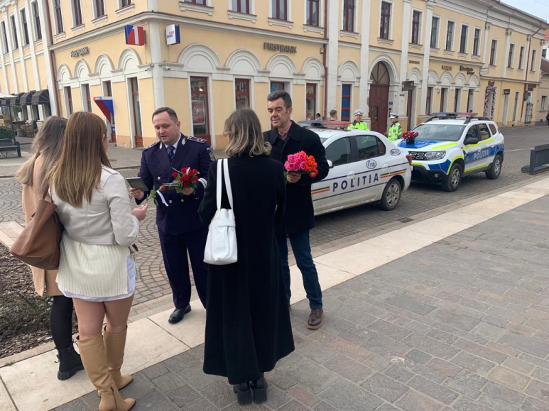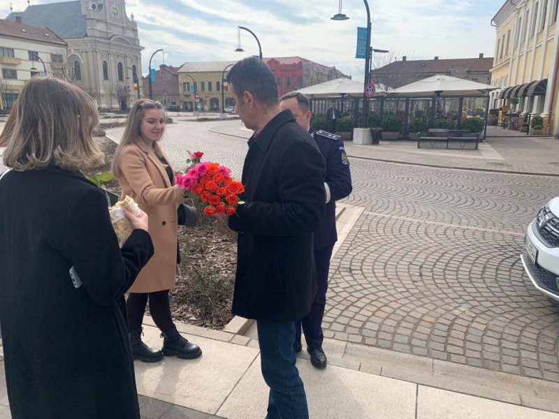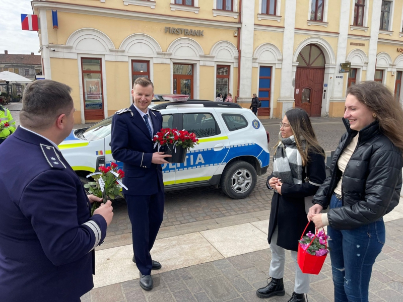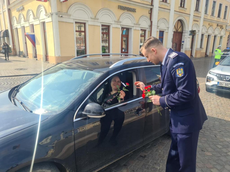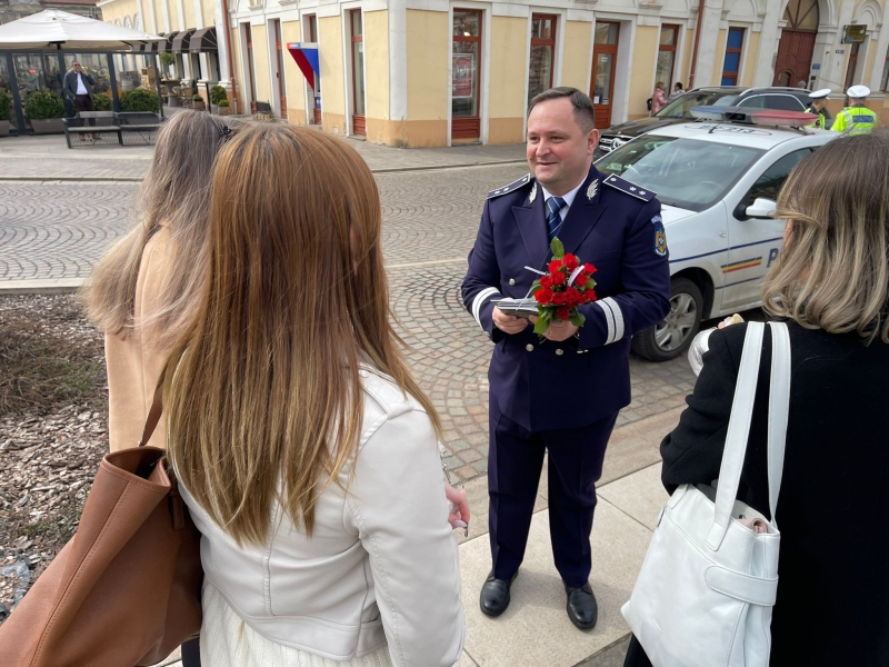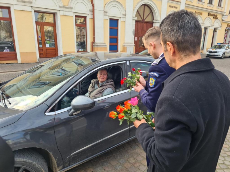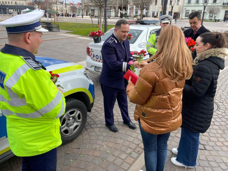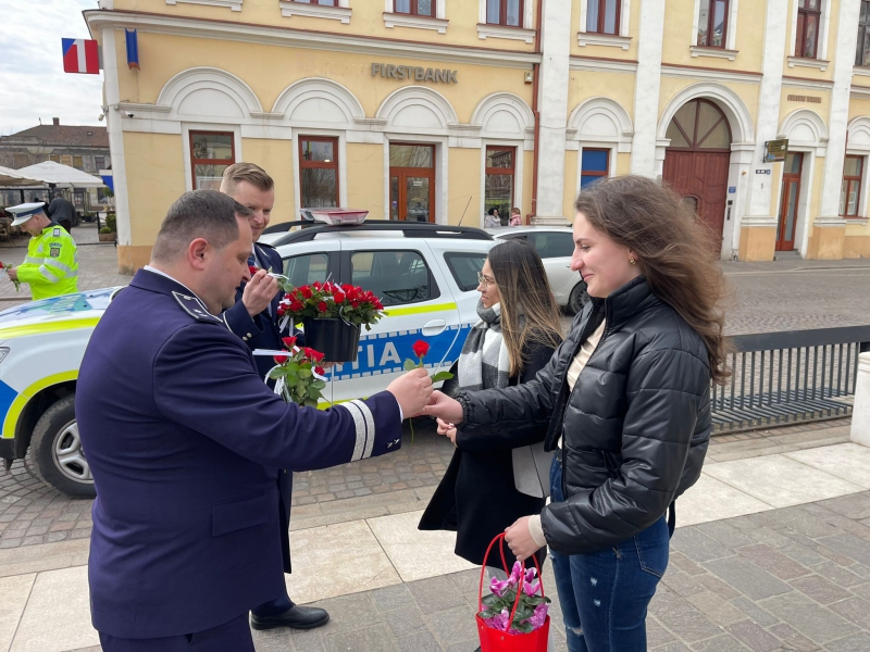 De 8 martie, femeile au fost întâmpinate cu flori și mesaje preventive, de polițiștii bihoreni.