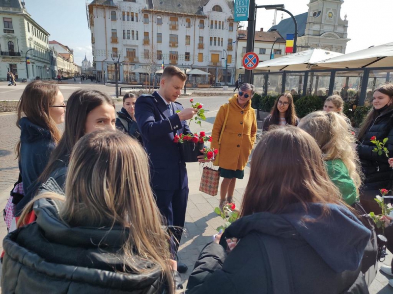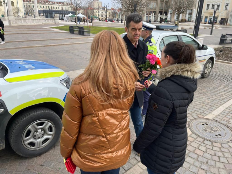 Acțiunile polițiștilor bihoreni au continuat în Piața Unirii din municipiul Oradea, unde, începând cu ora 12.00, doamnele și domnișoarele aflate în trecere au fost așteptate cu flori de polițiștii rutieri și de prevenire bihoreni, pentru a le aduce, astfel, zâmbetul pe buze.