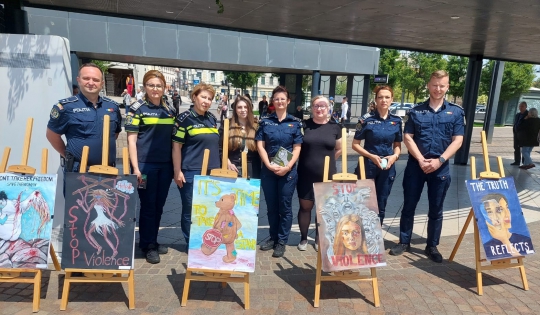 În eveniment au fost implicați și elevi ai Liceului de Artă Oradea, care au prezentat, într-o expoziție de desene, creațiile lor cu mesaje de prevenire a violenței domestice.