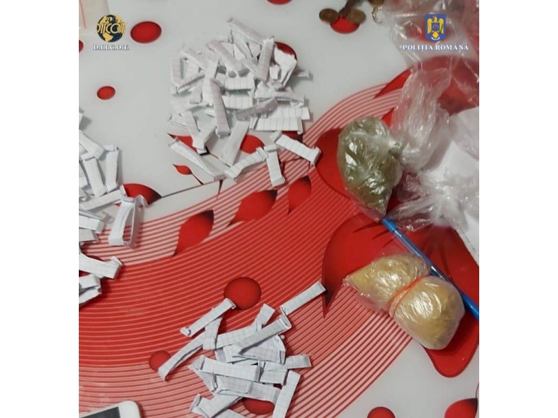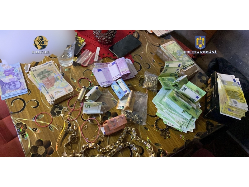 În urma perchezițiilor domiciliare, au fost descoperite și ridicate, în vederea cercetărilor, 132 de grame de materie vegetală, porționată în doze pregătite pentru vânzare, 110 grame de pulbere psihoactivă, destinată preparării unei cantități mari de droguri, 60.900 de lei, 40.130 de euro, 4.000 USD, telefoane mobile, balanțe electronice și 503 grame de bijuterii din aur.
