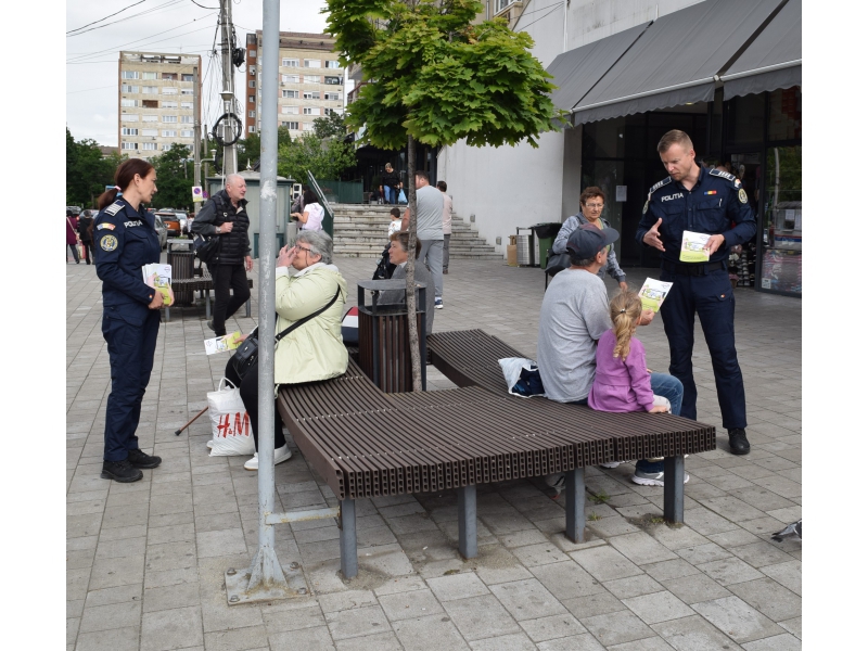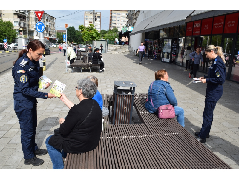 Astfel, joi, 23 mai a.c., în intervalul orar 10.00 - 11.00, sub genericul „Un om prevenit, un om salvat!”, polițiștii de la prevenire, în colaborare cu polițiștii Biroului Poliției de Proximitate Oradea, alături de jandarmi bihoreni au acționat pe raza municipiului Oradea, în zona pieței Rogerius, a Pieței Cetate și în proximitatea stațiilor mijloacelor de transport în comun, pentru prevenirea infracțiunilor contra patrimoniului, respectiv pentru prevenirea furturilor din bagaje, genți, prevenirea tâlhăriilor și a înșelăciunilor.